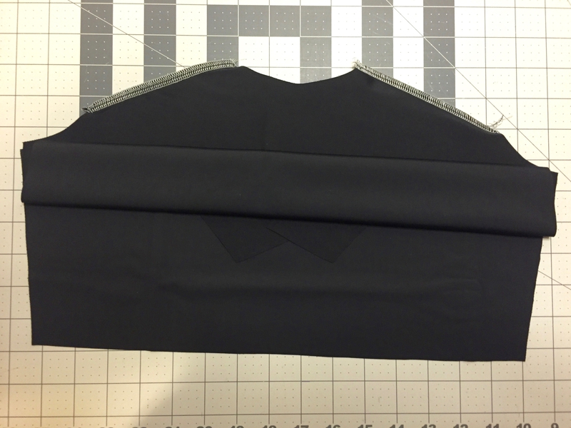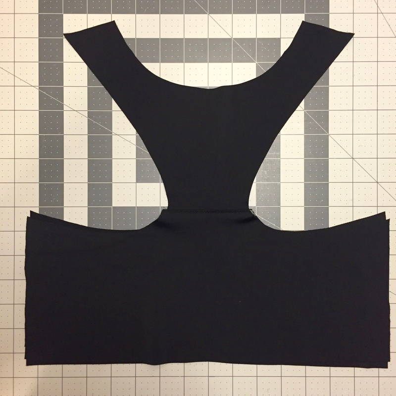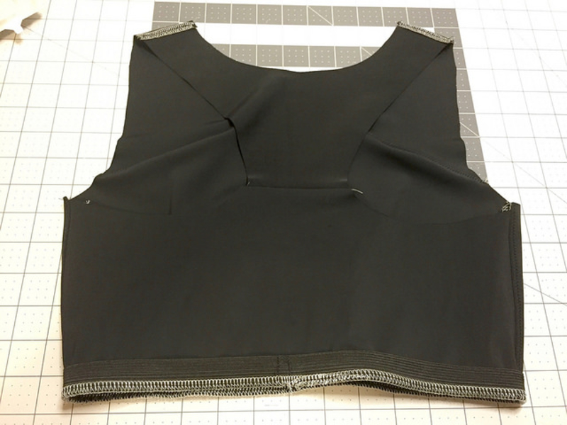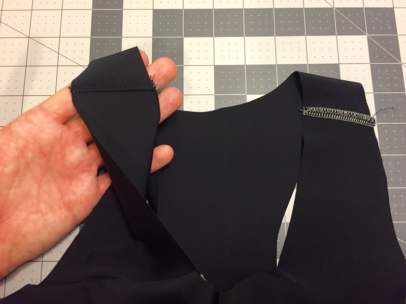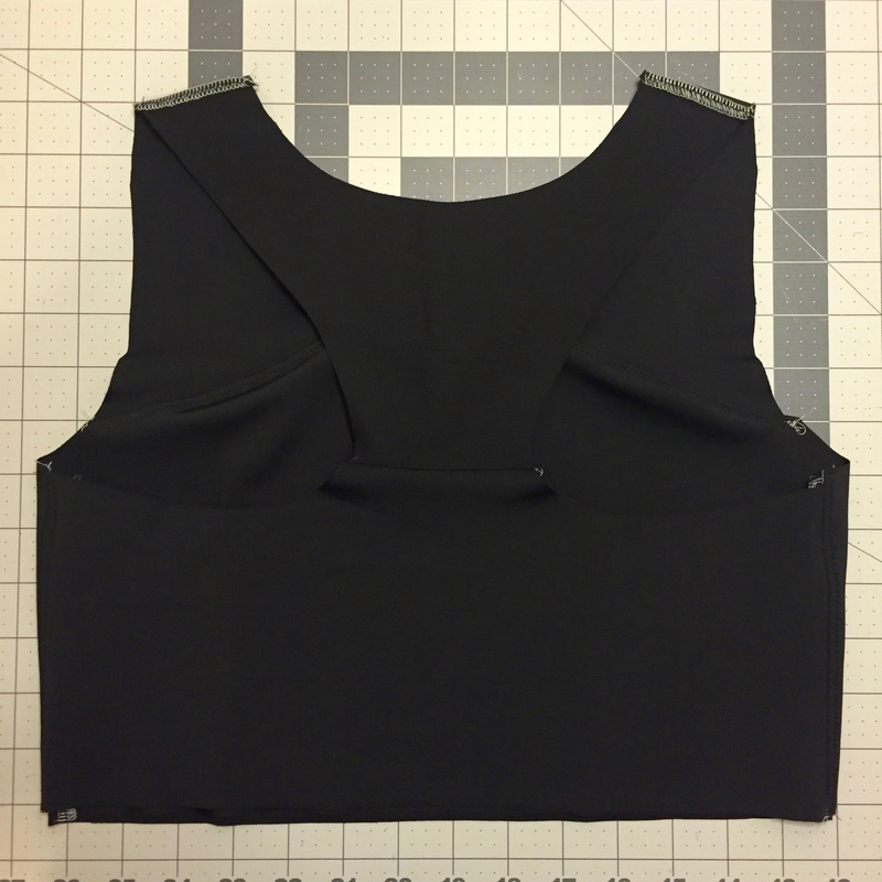 I did the same sandwich method for the back piece as well. When you are all done, the seam should be hidden between the two body pieces. At this point, I also zigzag stitched the seam to the “public” body piece just to stabilize the seam even more. You cannot easily tell in the image, but there is a zigzag stitch. I didn’t want to zigzag stitch to the inside lining piece, because that’s more stitching to cause chafing!