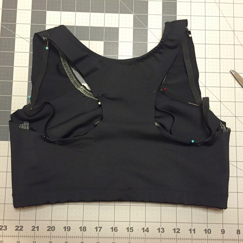 At this point, you can try on the sports bra to see how it fits. As you can see, the only exposed seam on the inside is the shoulder seam. All the other seams are hidden. To make my life easier, zigzag baste the raw edges together. I didn’t want to fight the two pieces of fabric slipping when attaching the elastic.