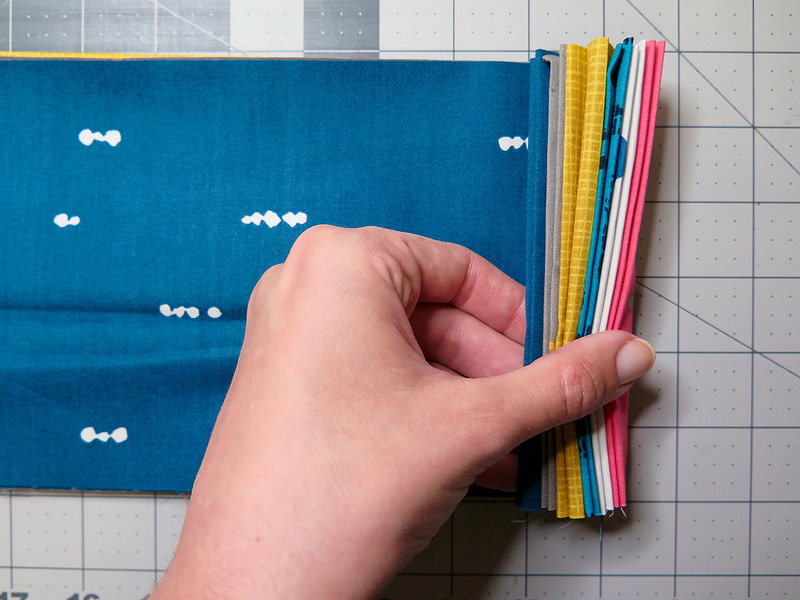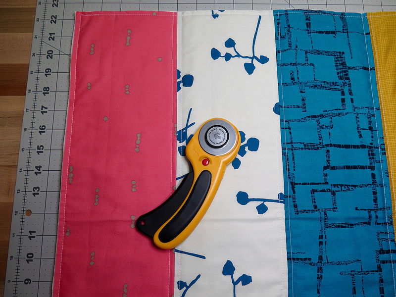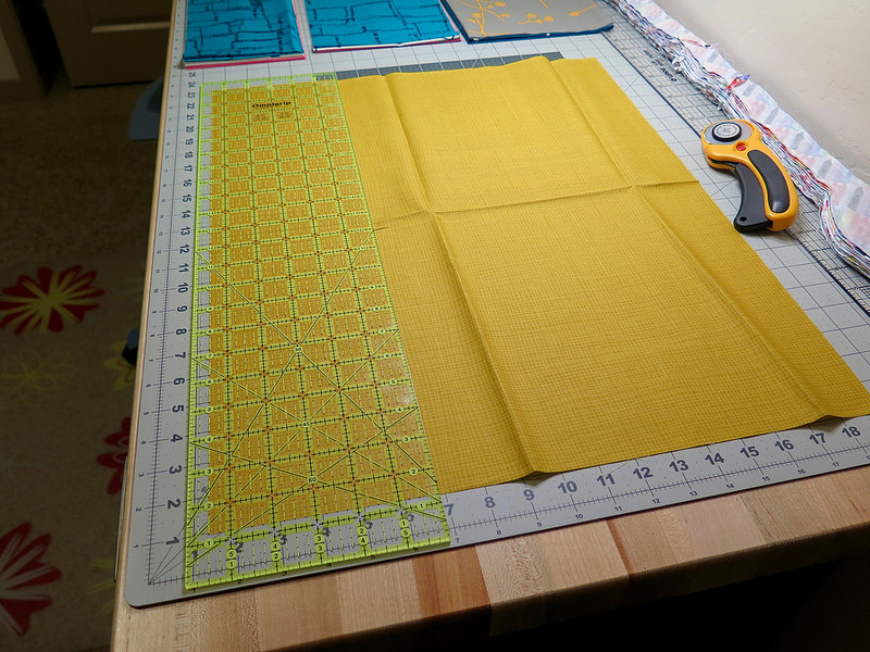 Choose 6 different fat quarters to be used as the front quilted top. The remaining four fat quarters will be used for the sham backs. Cut each fat quarter into two pieces measuring 5 ½” by 21 ½” (I recommend using a rotary cutter and mat for this step). You will have a lot of fabric left over, so save your scraps!