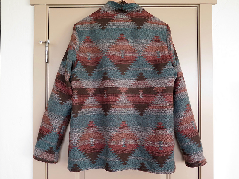 I chose to use my serger to finish the edges and then I hemmed everything with a 1/2″ seam. The jacquard knit looks great with a folded hem and didn’t result in any weird warbling, warping, or curling. Overall, I’m super happy with the style and fit of this blanket style jacket. It looks great over a basic button-down shirt. I can tell, I need to make a couple more in boiled wool fabric for the winter.