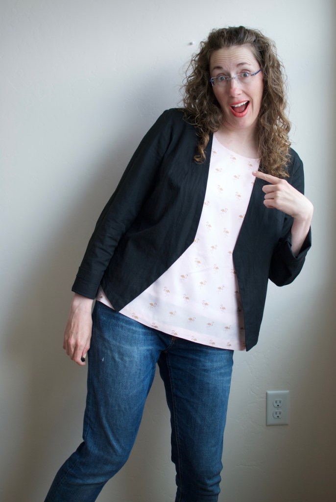 Ground’s Hog day? Nope, just love the shirt and jacket combo that I wore yesterday that I decided to wear it again today. Today I’m wearing my other New Look 6481 jacket and another newly sewn Grainline Studio Willow tank. And who doesn’t want to wear pink rayon with gold flamingos?! If you want to know how to sew a lined sleeveless top, check out this YouTube video (see here). Once you’ve attached your lining to your garment, then you just hem your shirt and lining separately. I raised the hem on my lining quite a bit so you’d never see it peeking out underneath. Probably hemmed it a bit too high, but oh well. I just love the gold flamingos!