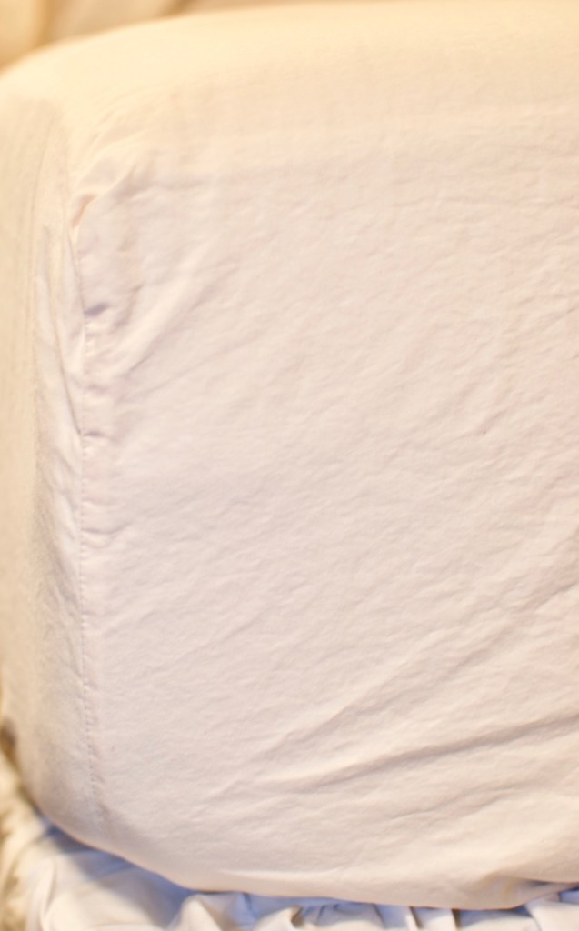 Once your elastic is attached to the wrong side, fold the elastic over and stitch down. Keep the elastic taut and carefully and consistently feed it through your sewing machine. I set my presser foot pressure at maximum and used a straight stitch with a stitch length between 3 and 4. Fitted sheet is done!