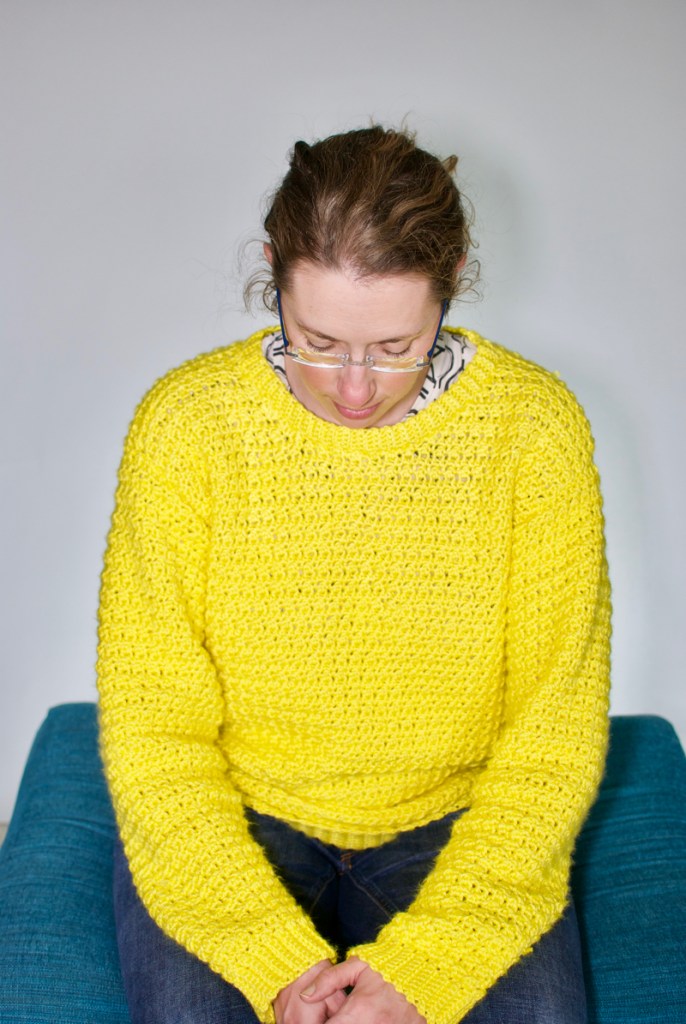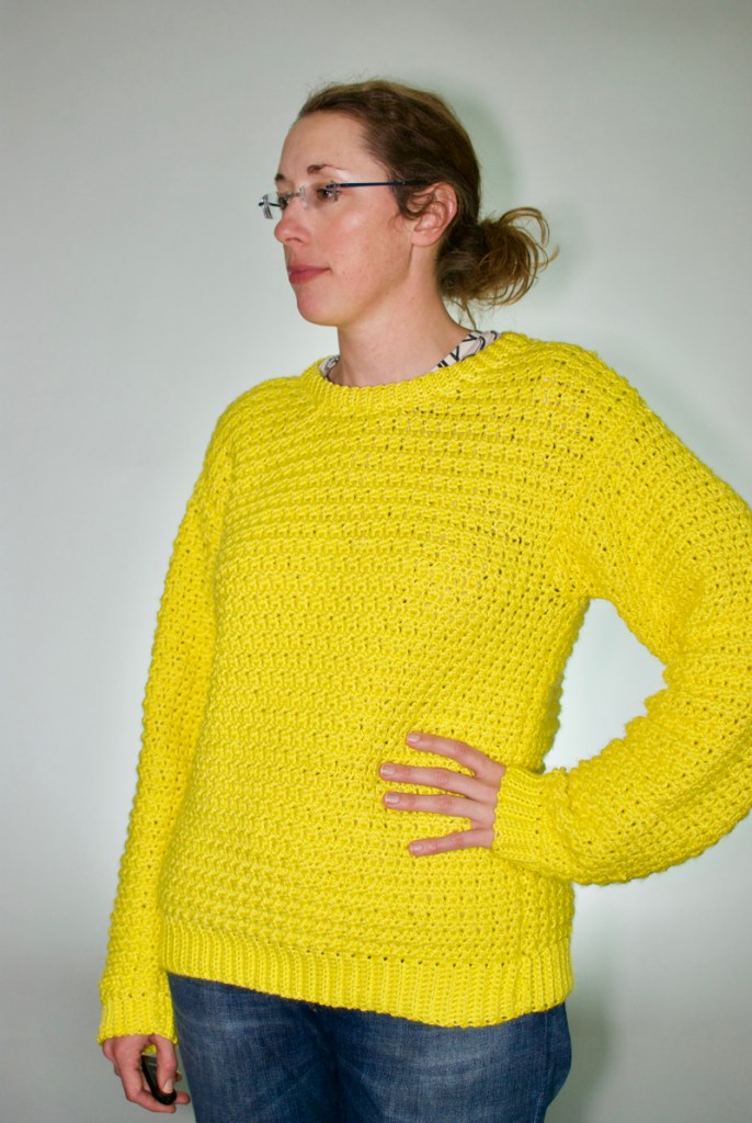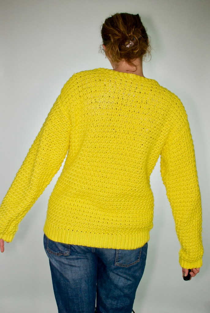 The first time I made this sweater I made it in in size large. This yellow version I made size medium. The nice thing about making your own clothes is that you can size down, but still make the length long enough! I just wish the arms weren’t so baggy.