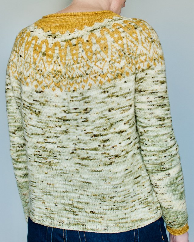I only had to go up one needle size on my stranded work, US 7 (4.5 mm). I’m still debating if it would have been better to go up two sizes to US 8 (5.0 mm) needle? I could have done a better job at the beginning of the yoke, but I’m so pleased with the rest of the yoke.