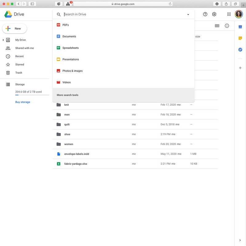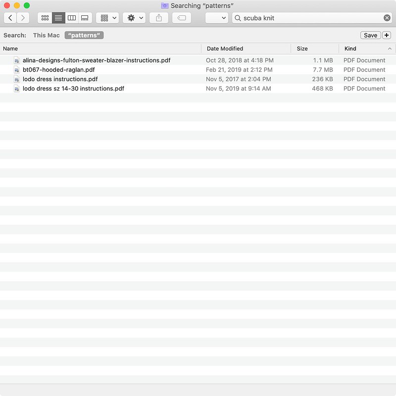 One of the features of using a Cloud service like Google Drive, is often you’ll be able to search within a file. For example, let’s say I want to find all my patterns that recommend using “scuba knit”? I can simply do that on my Google Drive webpage using Advanced search options. I narrowed my location to my ‘PATTERNS’ directory and looked for documents containing the phrase ‘SCUBA KNIT’.