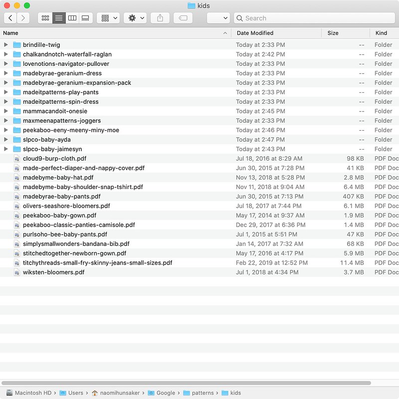 I’m not the type of sewer that collects patterns. I buy only when I need something, and chances are I will purchase digitally. I don’t love taping together patterns, and waiting for a copy shop version isn’t always ideal, but I really don’t like tissue patterns. Tissue paper is just an extra level of annoyance. I worry about tearing it. It’s slippery and doesn’t ever want to hold in place. Most of the time, it was poorly folded, and I have to iron out the creases, literally. So this post is about how I organize all my digital patterns since that’s my primary source for patterns.