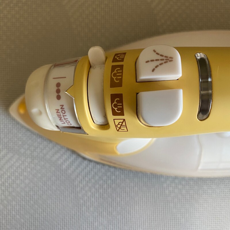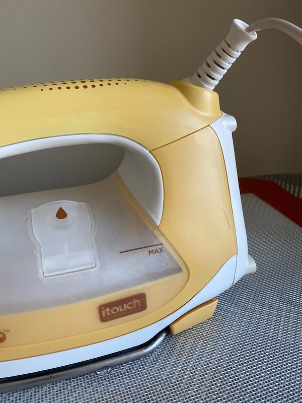 If the iron isn’t completely full of water, it won’t automatically steam. The only way I can get the iron to steam is to repeatedly push the steam button over and over and over again. I’ve pushed that button so many times that the symbol has thoroughly rubbed off! I don’t use the other button to squirt water, as you can see.