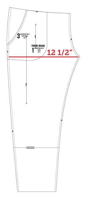 Let’s see if I can make this math clear. My crotch measurement is 13 ½ inches. I would need to add ½ inch of ease to the side seam and probably about ¼ inch of ease to the inseam. Add all that up, and I should have a crotch measurement of 14 ¼ inches. The pattern is only 12 ½ inches. Spoiler alert, I need to add 2 ¼ inches to the crotch hook length, so that would add to 14 ¾ inches, and that would give me slightly more width than I would need. I could then shave off a ½ inch from the side seam.