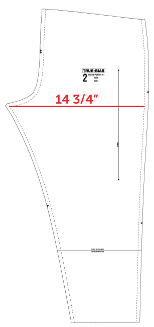 I need the same amount of room for my back crotch length, 14 ¼ inches. The pattern crotch measurement is 14 ¾ inches. I’ll discuss this in a moment, but I need to remove ½ inch from the back crotch curve length, so now my crotch width measurement is perfect, 14 ¼ inches.