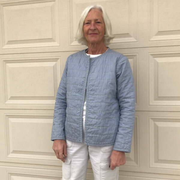 I’ve been desperately trying to get as close as I can to having no stash, so I wasn’t going to buy new fabric for this project. I used fabric I’ve had in my stash since 2017. The jacket was created entirely out of Art Gallery smooth denim solid infused hydrangea fabric. I knew that I wanted to hand-stitch the quilt so it would not be so boring. I used lemon Hidamari Sashiko thread for my stitching. Finally, I knew I wanted a good drape on the jacket, so I used Orient Dream quilt batting. The batting is a blend of bamboo, silk, Tencel, and cotton. The batting and thread were the only things not already in my stash.