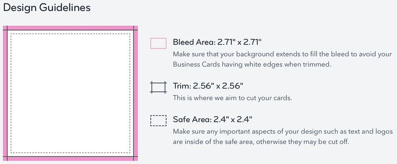 I choose square business cards as my design. The bleed area is 2.71″ x 2.71″. The final card is trimmed to 2.56″ x 2.56″. The safe area for text and design is 2.4″ x 2.4″.