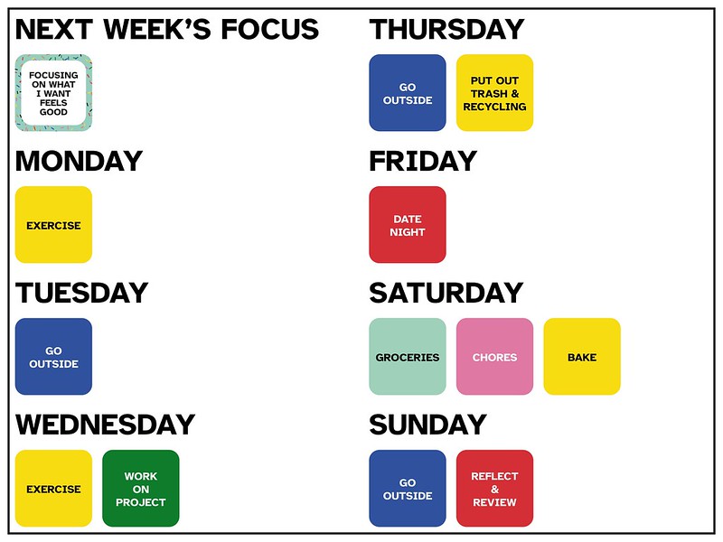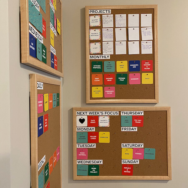 I wanted to go as small as possible, so the corkboards are 18 inches by 24 inches. We ended up with 4 cork boards: this week’s schedule, next week’s schedule, daily/weekly tasks, and monthly/big projects. I created a mockup of the boards through Adobe InDesign and printed the boards on normal 8.5 by 11 paper for a few weeks to pilot the ideas.