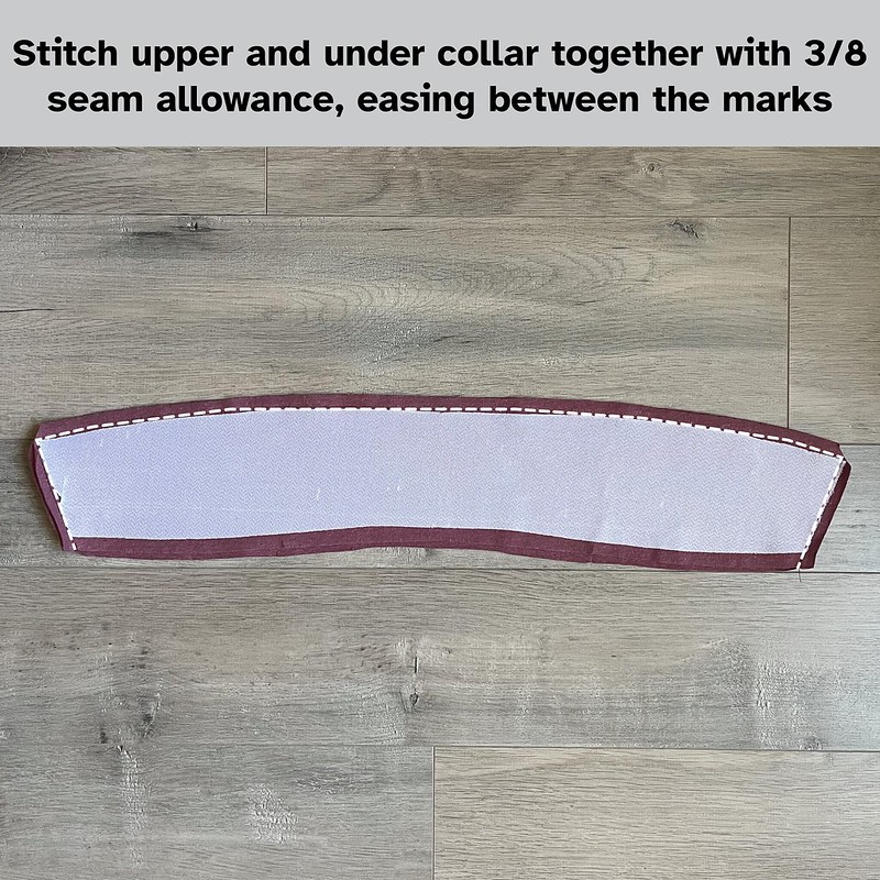 With right sides together, stitch the upper and under collar together with a ⅜ inch seam allowance. You will have to stretch the under collar since it is smaller. Stretch / ease between the mark on the pattern piece.