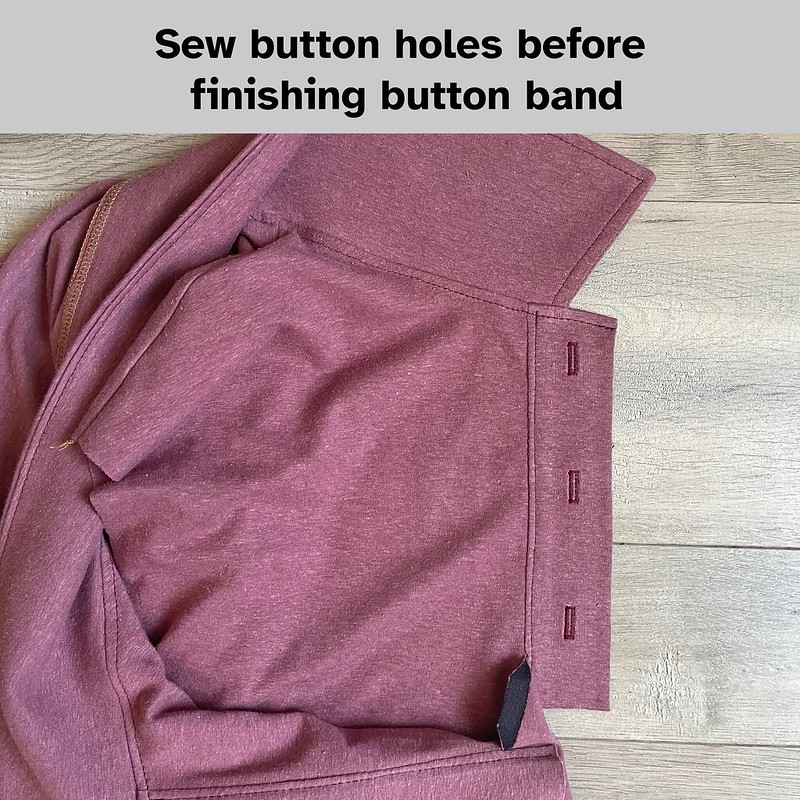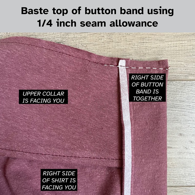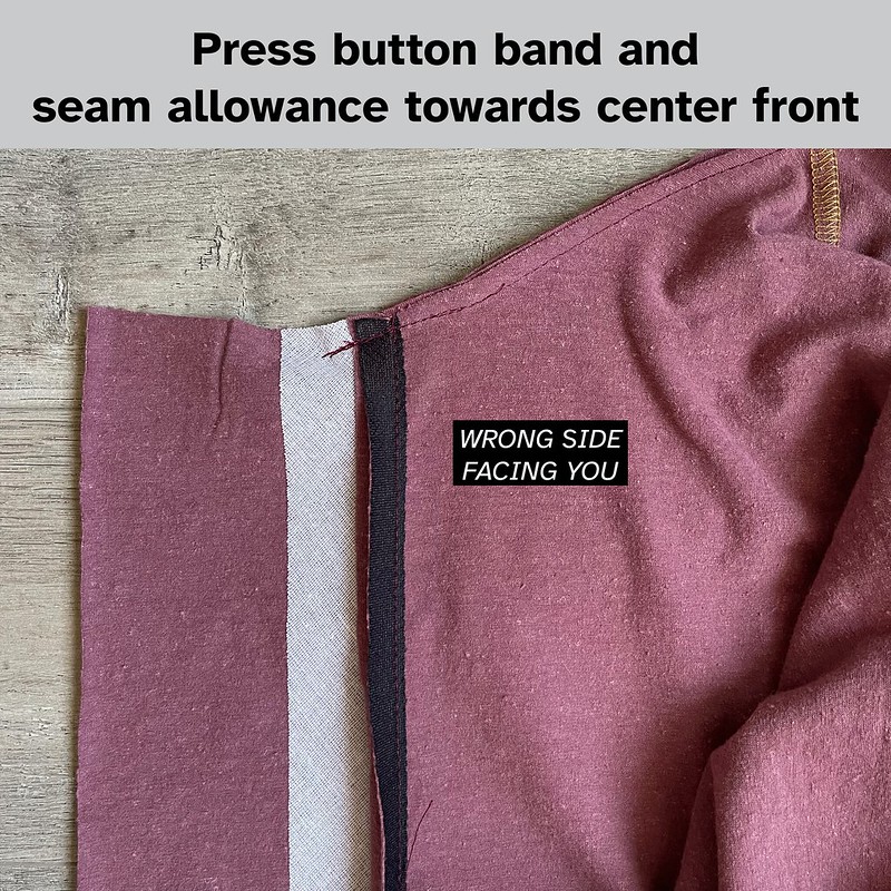 Baste stitch the button band together as well. Make sure all seam allowances are folded towards the center front, so when the button band is turned inside out, raw edges are hidden completely.