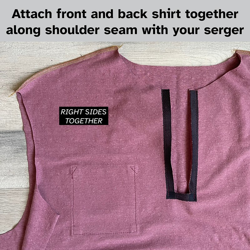 This is the first step that uses a serger and not just a regular straight stitch on your sewing machine. If you don’t have a serger, use a stretchy stitch like a zigzag stitch to attach the front and back pieces along the shoulder seam.