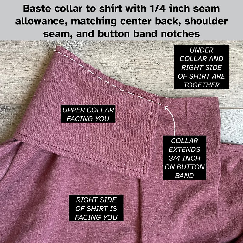 First, I basted the collar to the neckline. With the right side of the shirt facing you, the under collar is facing down, and the upper collar is facing you. If you forgot to mark where the collar should end on the button band, measure ¾ inch from the seam.
