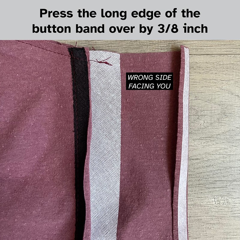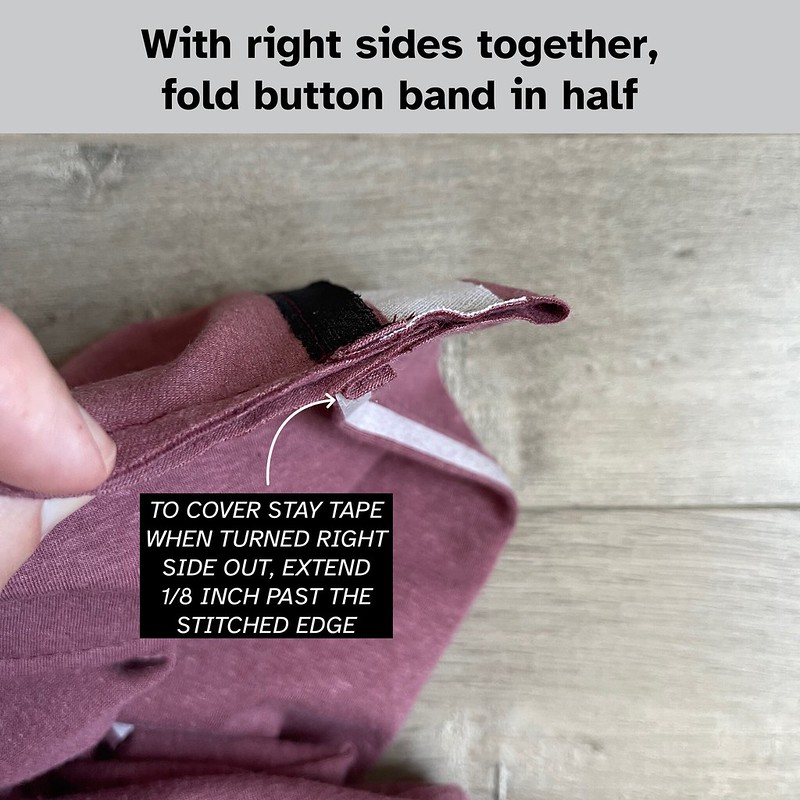 Fold the button band nearly in half with right sides together. I like to extend the folded edge ⅛ inch past the placket stitch line, so the stay tape is hidden when the button band is turned right side out. I know when I top stitch the button band closed, I’ll catch the fabric in the back.