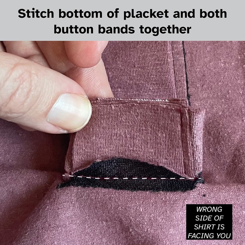 This next step is just like stitching the sides of a welt pocket. With everything flipped to the wrong side of the shirt, stitch all the layers together: bottom of the placket and both button bands. Take your time aligning the button bands on top of each other.