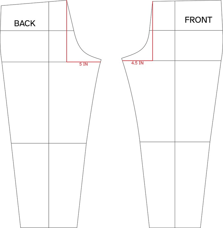 I prefer using crotch hook length. To obtain this measurement is to draw a horizontal line at the crotch level. My image above contains a 3/8 inch seam allowance, which is why the crotch level is slightly lower. Next, draw a line vertical from the center front or center back down to the crotch level. The crotch hook length is the distance from where these two lines meet to the inseam. I have a crotch hook length of 5 inches for the back. I have a crotch hook length of 4.5 inches for the front.