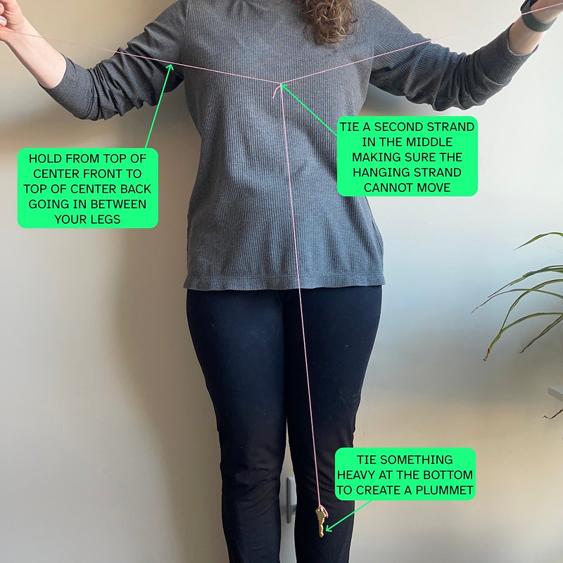 If anatomy just isn’t your thing, you can also use a plumb bob to find your crotch point. I cut two long pieces of string. One piece of string was held like I was trying to measure my crotch length, and the second piece of string was securely fastened at the center with a heavy-ish object hanging from it to act as a plumb bob.