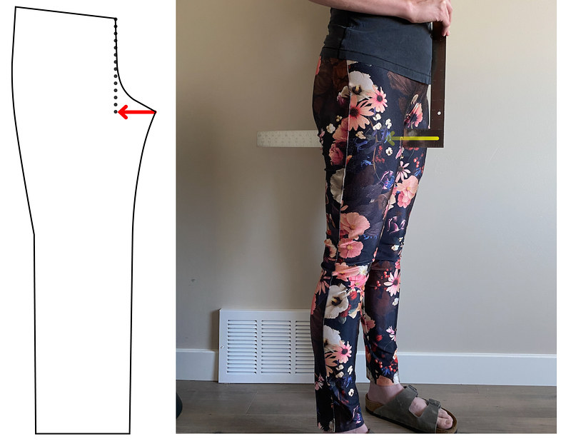 Again, I don’t find this measurement perfect, but it is helpful to get a general idea. I place my L-shaped ruler gently again my body while keeping the horizontal portion perfectly level. The crotch hook length is the distance to your crotch point (yellow arrow on body, red arrow on pattern). Many patterns have front crotch hook lengths of ~1.5 inches, but clearly, I knew I needed to add more length from this method!
