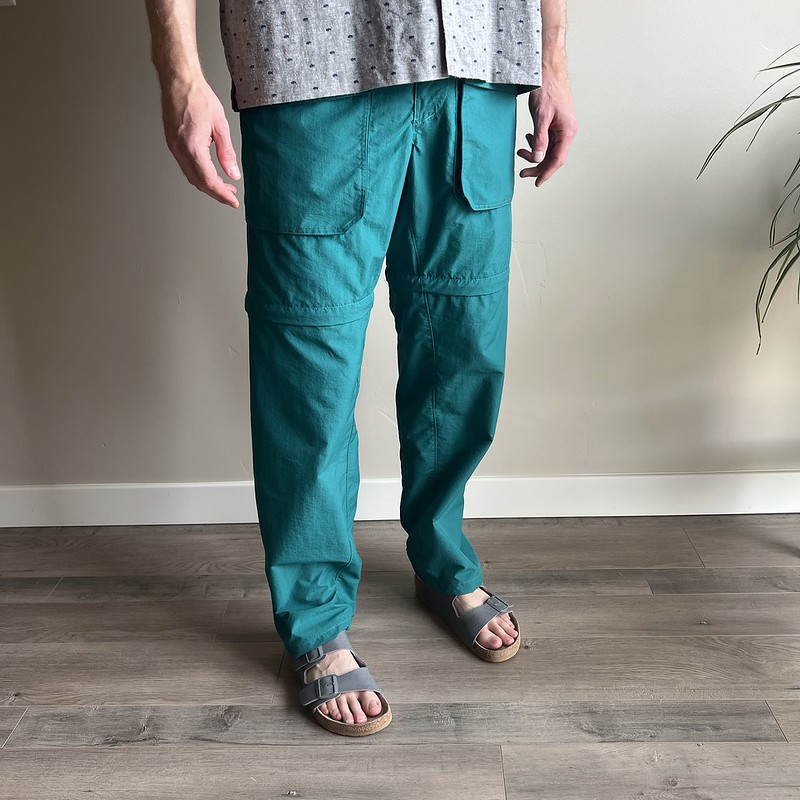 I used Taslan 2ply fabric for these hiking pants. The material is similar to a pair of the North Face hiking pants I had in the early 2000s. My pants are burgundy, and Ryan’s are dark teal. The pattern calls for 2-1/2 yards, but I needed 3 yards. The nylon fabric has absolutely no stretch but is breathable, lightweight, and water-repellant.