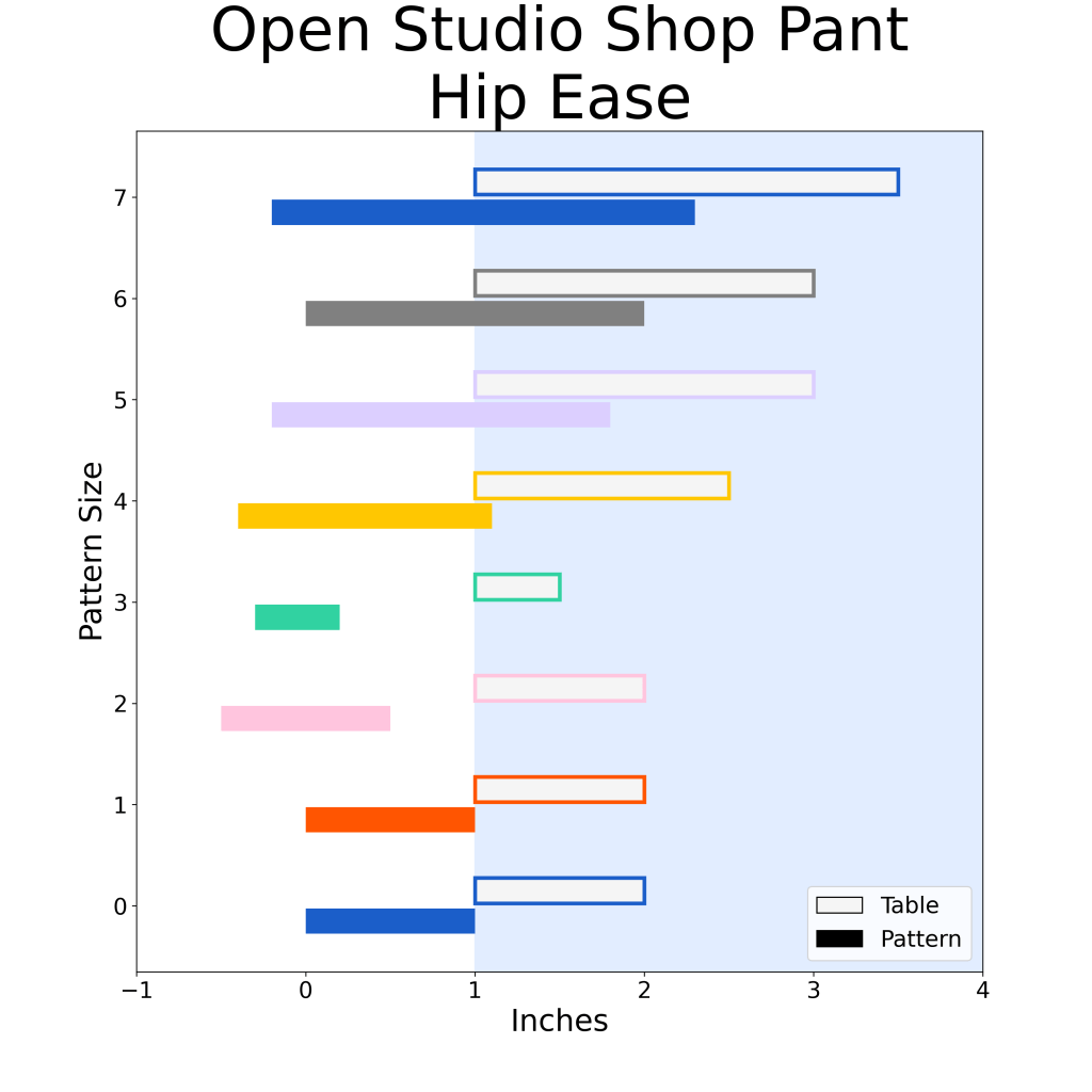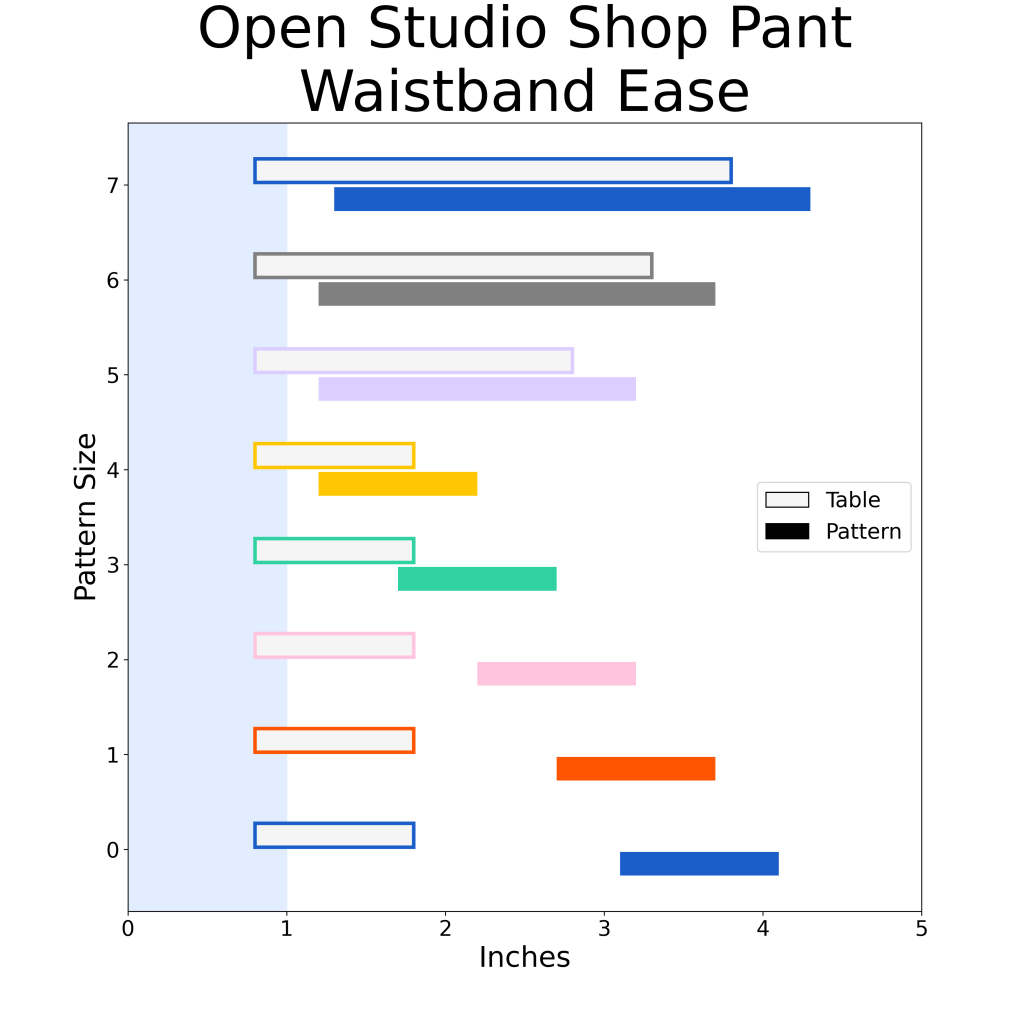 These graphs really highlight the peculiarity of ease across the sizes. Again, the x-axis is in inches, and the y-axis is each size. The shaded light blue area represents an expected ease amount. The open boxes are the intended ease (columns 7 and 8 from the table above). The filled-in boxes are the actual ease (columns 9 and 10 from the table above). The pattern was intended to have a waistband and hip with an expected amount of ease (open boxes). However, the pattern pieces have too much ease in the waistband and not enough ease around the hips (filled-in boxes). The error in waistband ease is so systematic that it has to be a glitch in the computer grading/output!
