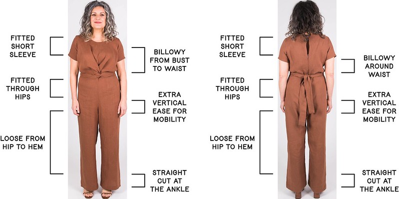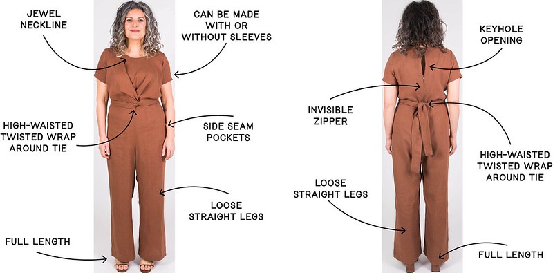 The bodice features a jewel neckline and a twisted wrap-around tie detail and can be worn with or without sleeves. The back bodice includes a top button loop closure, a keyhole opening, and an invisible zipper. The trousers have side seam pockets and loose-fitting straight legs. The hem should hit below the ankle bone. From photos, the wrap-around tie detail should be just below the bust and at or above the natural waistline. The crotch curve should not sit too close to the body, which makes sense, being a jumpsuit. There needs to be some ease, so you don’t give yourself a horrible wedgie when you lift your arms. The jumpsuit generally looks fairly relaxed and should only be slightly fitted through the hip area.