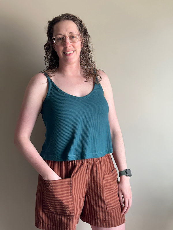 I made my tank top using Meet Milk Derby Ribbed Jersey in Emerald. The material is a medium-weight ribbed stretch jersey made with 95% TENCEL and 5% elastane. The material is 230 g/m2 (~7.4 oz). The elastane takes comfort to the next level, offering an extraordinary buttery soft touch with high elasticity and an even higher level of comfort with a lovely relaxed, and fluid drape.