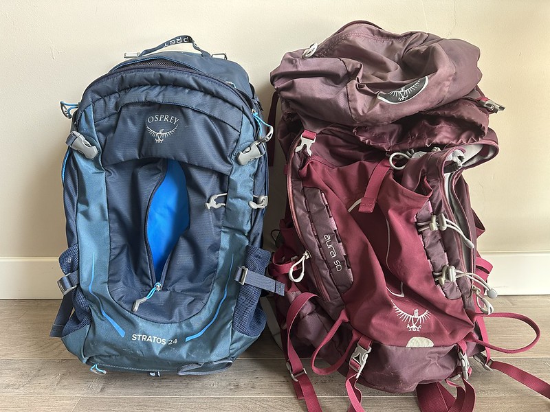 My old pack, the purple/red bag, is the Osprey Aura 50, and it weighs a whopping 4.29 lbs. Last year I tried to downsize my 50L pack to 24L because I didn’t need that much room. I had the 50L pack for the hip belt and adjustable frame. Osprey has started including adjustable frames and padded hip belts in their smaller packs. So I tried the Osprey Stratos 24 pack. The Stratos weighs 2.67 lbs. I wanted the hip belt and adjustable frame to keep the weight off my shoulders because I quickly get headaches from the shoulder strain.