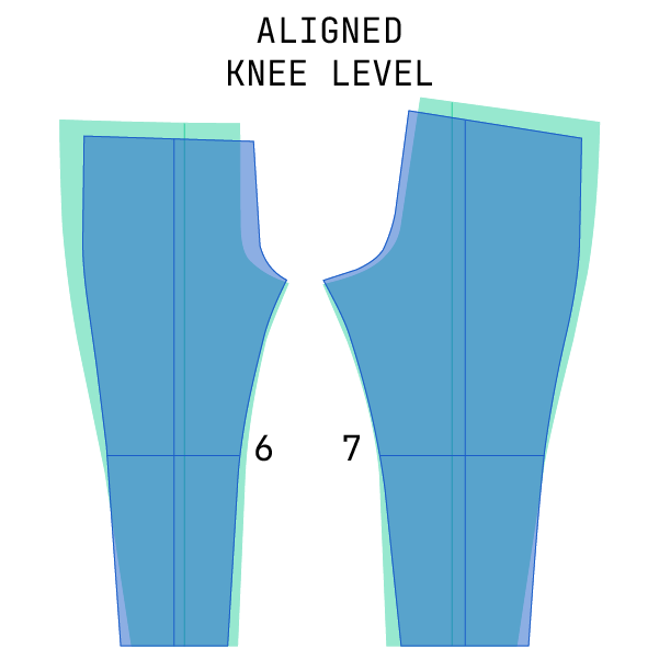 I didn’t label the knee level but see, in the 6-14 size range, the center grainline does not bisect the knee level. The center grainline bisects the knee on the smaller size range (blue pattern) piece. The 6-14 size range pattern pieces are drafted with ~1 inch extra at the side seam.