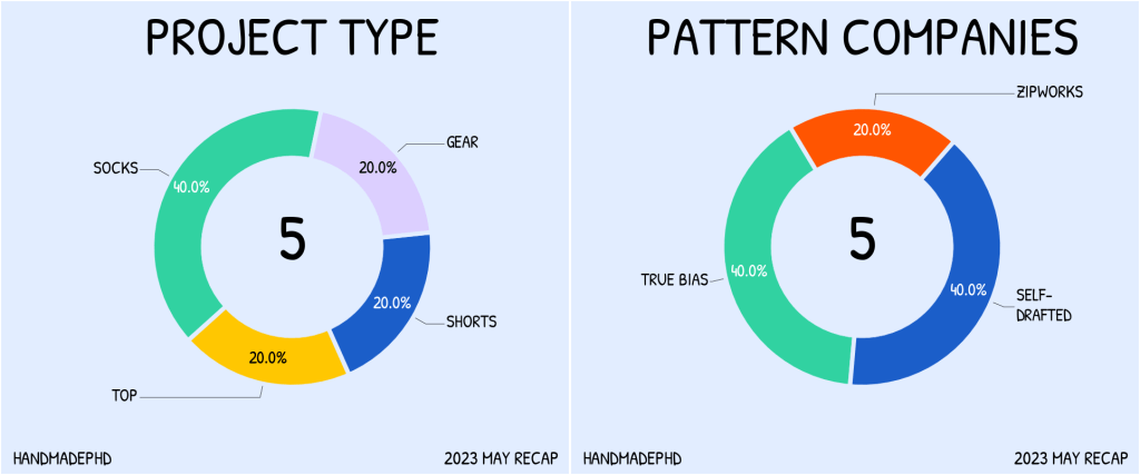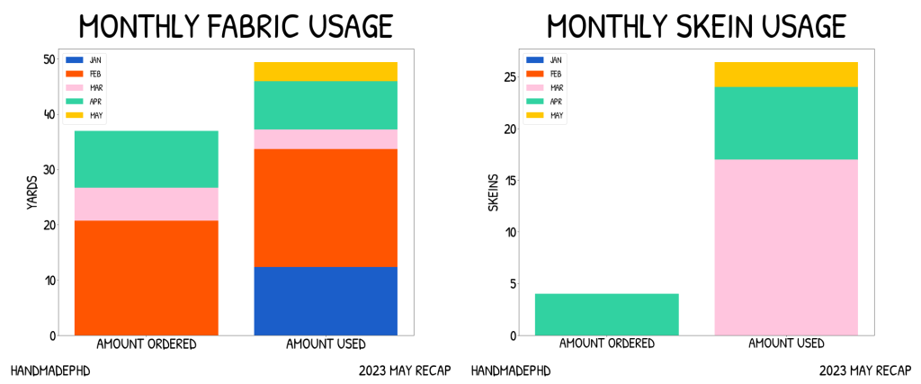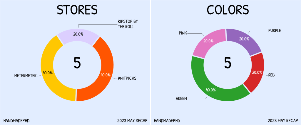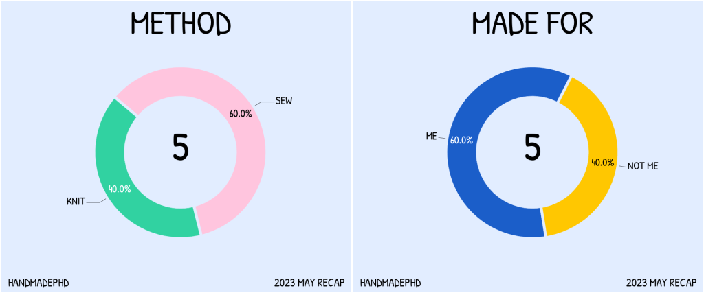 I am sharing my progress for May early since I will be occupied with packing for an upcoming vacation and won’t have time to work on sewing or knitting projects. I am thrilled with the results of this month’s recap because I have fully automated the process. I taught myself how to draw SVG images using Python, which allows me to generate all images, including the title figure and non-graphic images, automatically. The only downside is that I couldn’t use the XKCD font and had to move to a Google Font. I tried to alter the drawsvg code to allow user fonts, but it never worked.