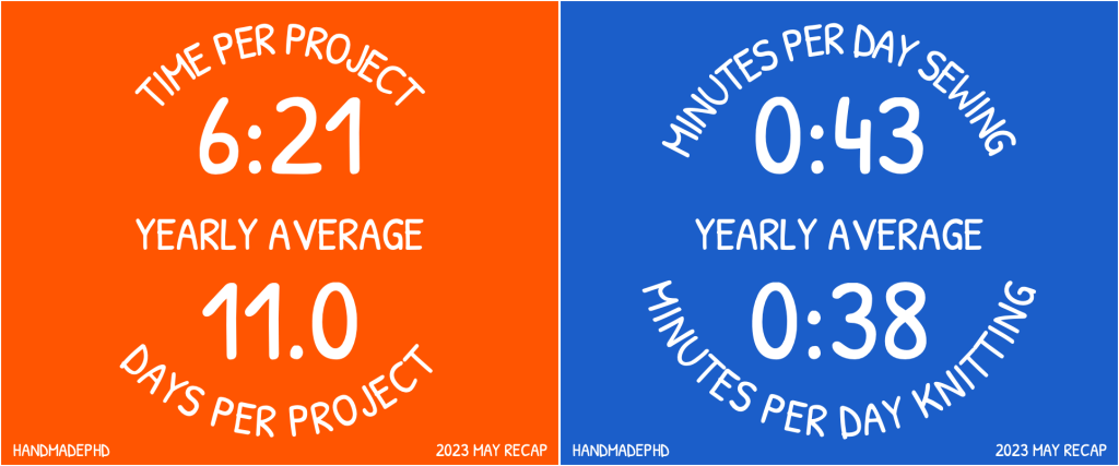 Out of the 37 projects, it has taken me on average 6 hours and 21 minutes across an average of 11 days to complete something. I typically spend 43 minutes daily on sewing and 38 minutes on knitting.