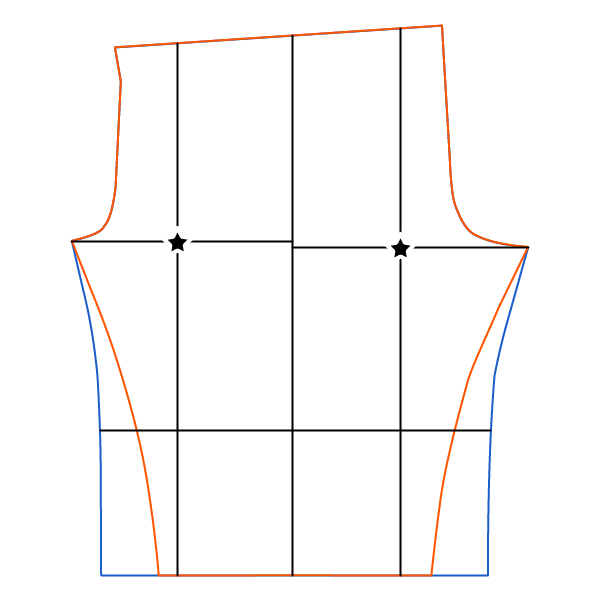 Whether wearing the pants or using VStitcher, I marked the center grainline along the crotch level. To find the center grainline, stand before a laser level, lining up your ankle and the midpoint of your knee. The point at which the laser crosses the horizontal crotch level is your center grainline position. From there, draw a vertical line down to the hem and up to the waistline.