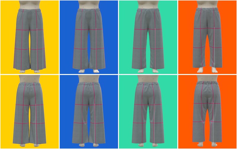 Here is how the two versions look on the avatar. This avatar is wearing size 20 of the Pomona pants. The avatar’s bust is 46.5 inches, waist is 39 inches, and hips are 49 inches. The wide-leg version is displayed with a blue background, while the narrow-leg version has a red background, just like the flat diagrams above. On the right side of the avatar, a thin white vertical line originating from the crotch level marks the avatar’s center grainline. In other words, the white vertical line represents the laser level. By observing the hem, you can see if the center grainline on the pants matches the avatar’s center grainline. The wide-leg version turned out to be almost perfect, which happened to be the version I utilized when creating my shorts. The wide-leg version only has a slight deviation towards the side seam. On the other hand, the narrow-leg version has a noticeable deviation towards the inseam. If I had opted for the narrow-leg version, I would have faced the challenge of having to adjust the center grainline correctly for my body. Thankfully, the Pomona shorts are based off of the wide-leg version!