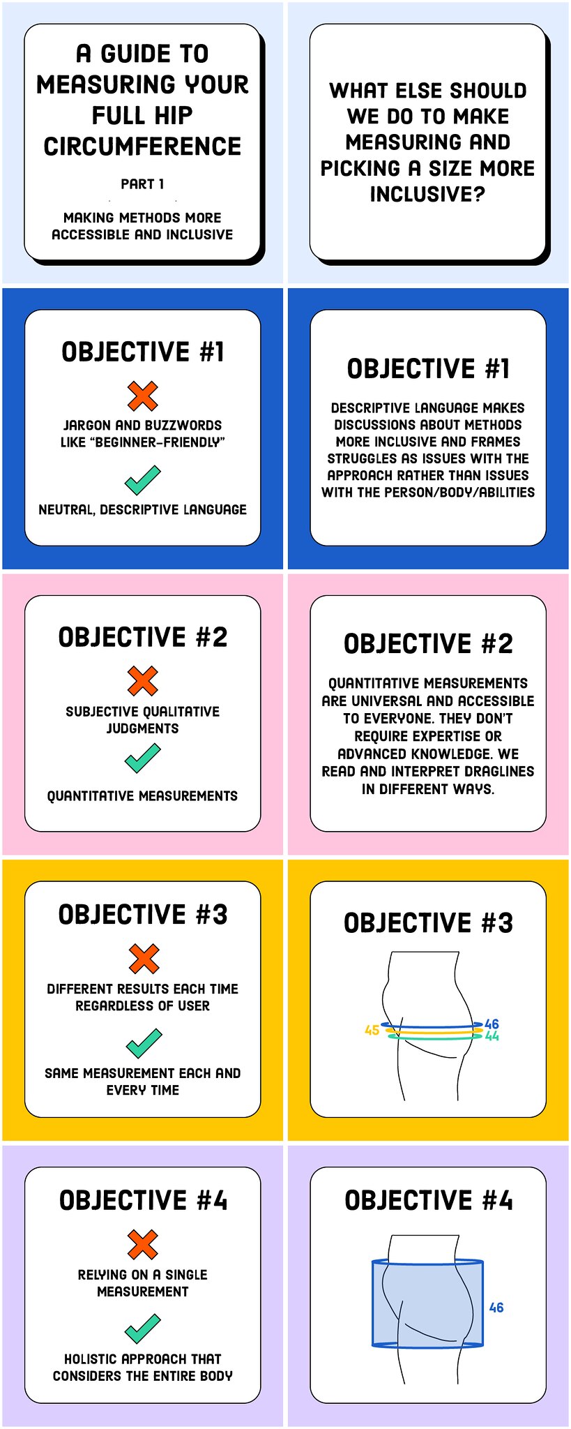 Additionally, in the context of pant fitting, qualitative data cannot be impartial to one’s body shape and size. It has felt a bit misleading to describe my current method of picking a pant size as impartial because part of the decision process involves judging my own body. I have to consider factors such as whether I have a forward-tilting pelvis, a prominent belly, or protruding buttocks. First, using descriptive methods to adjust sizing might accidentally leave someone out. What if the size adjustment decision-tree doesn’t account for all body types? Second, these qualitative judgments can be harmful to one’s body image. Any method that relies on qualitative data isn’t body-neutral. A body-neutral measuring technique should be usable and accessible by everyone and should include all body shapes and sizes.