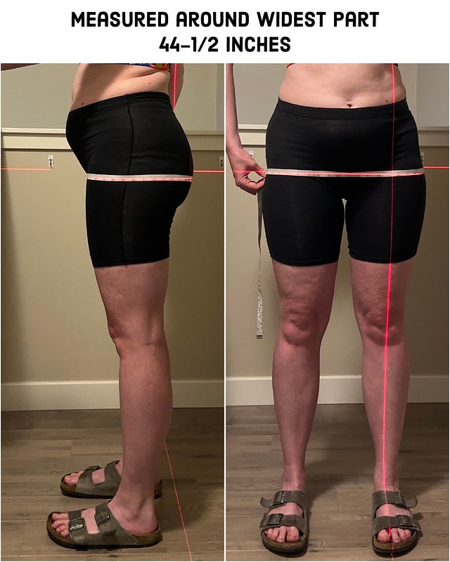 My waist at my belly button measures 35-1/2 inches. For my hip, if I just use the tape measure at my widest part, I measure 44 – 44.5 inches. If I measure where my butt protrudes the most and place a vertical yardstick at my belly, I measure 46 inches. If I measure using the poster board band, I measure 46 inches.