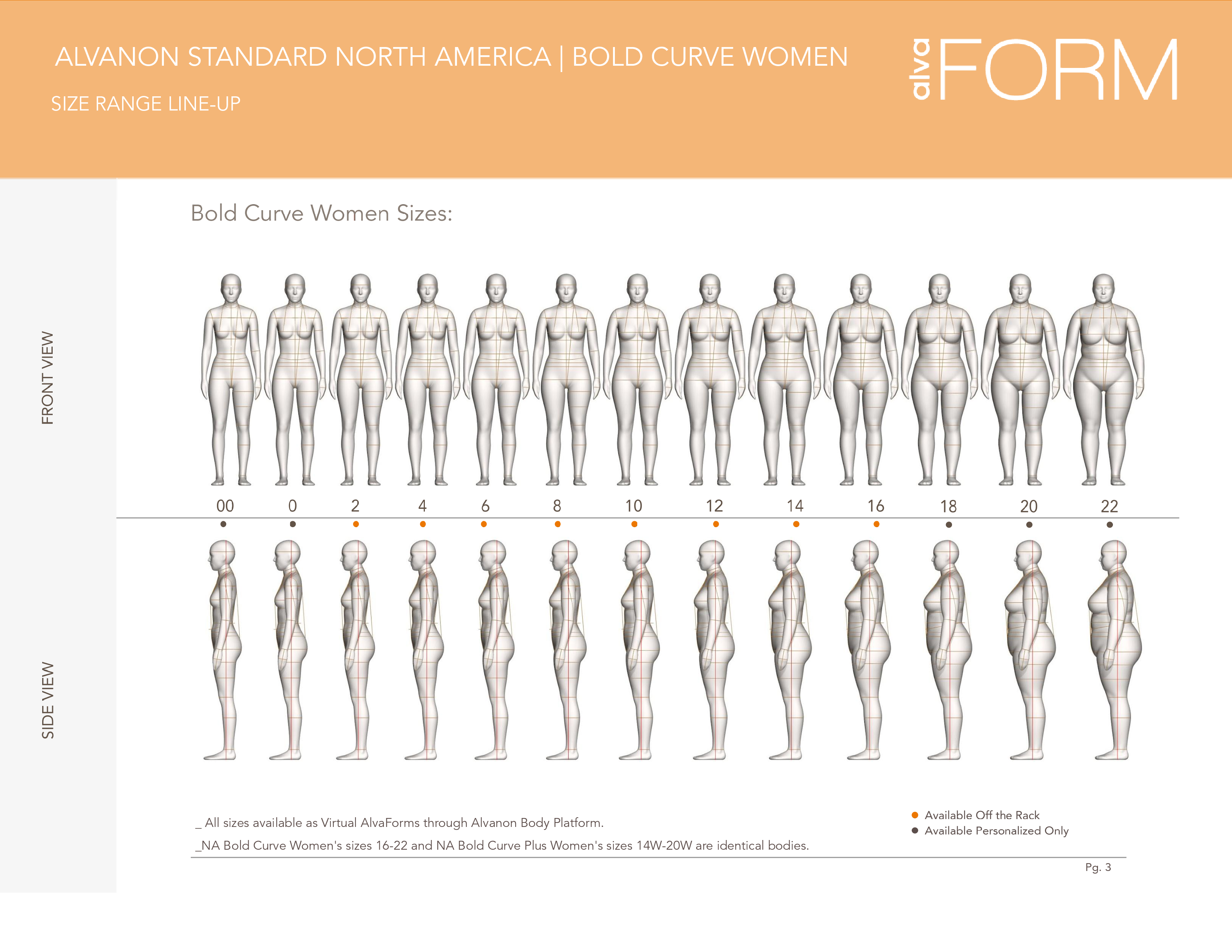 Let’s start with the assumptions made when patterns use an average body form. Take a look at sizes 00 – 14, and you’ll notice that there’s generally minimal stomach protrusion. However, as sizes get larger, there’s a consistent amount of stomach protrusion, and it is in the same spot across all sizes. Similarly, there’s a predetermined amount of butt protrusion that occurs at the exact location for every size. Moreover, the vertical distance between the waist and hip levels remains consistent for all sizes. All these body forms have the exact same posture. And finally, each size has its own specific across body depth and width, which increase as the sizes go up. But here’s the thing—very few people truly match these “average” body forms because there are so many variables to consider. Let’s unpack those key variables in a bit more detail.