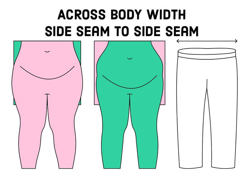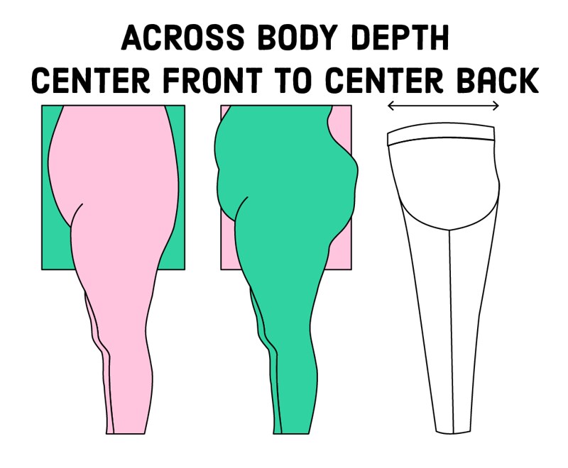 The second variable is across body depth. This represents the horizontal measurement from center front to center back. Although the pink body has a wider across body width, its across body depth is narrower than the green body. This is how the two bodies can have the same hip circumference.