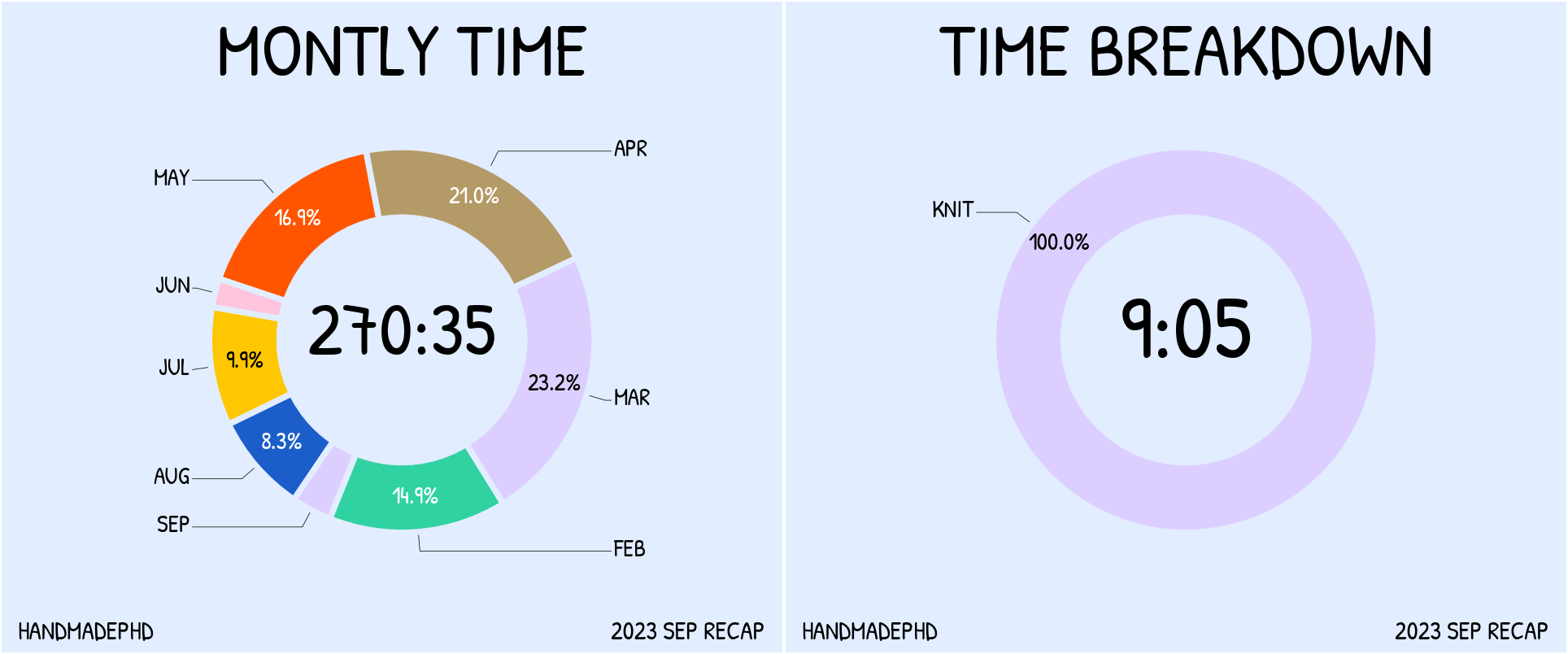 My time spent crafting this month only includes knitting. I didn’t measure my time with the trousers, unfortunately. I only spent 9 hours and 5 minutes this month knitting socks.