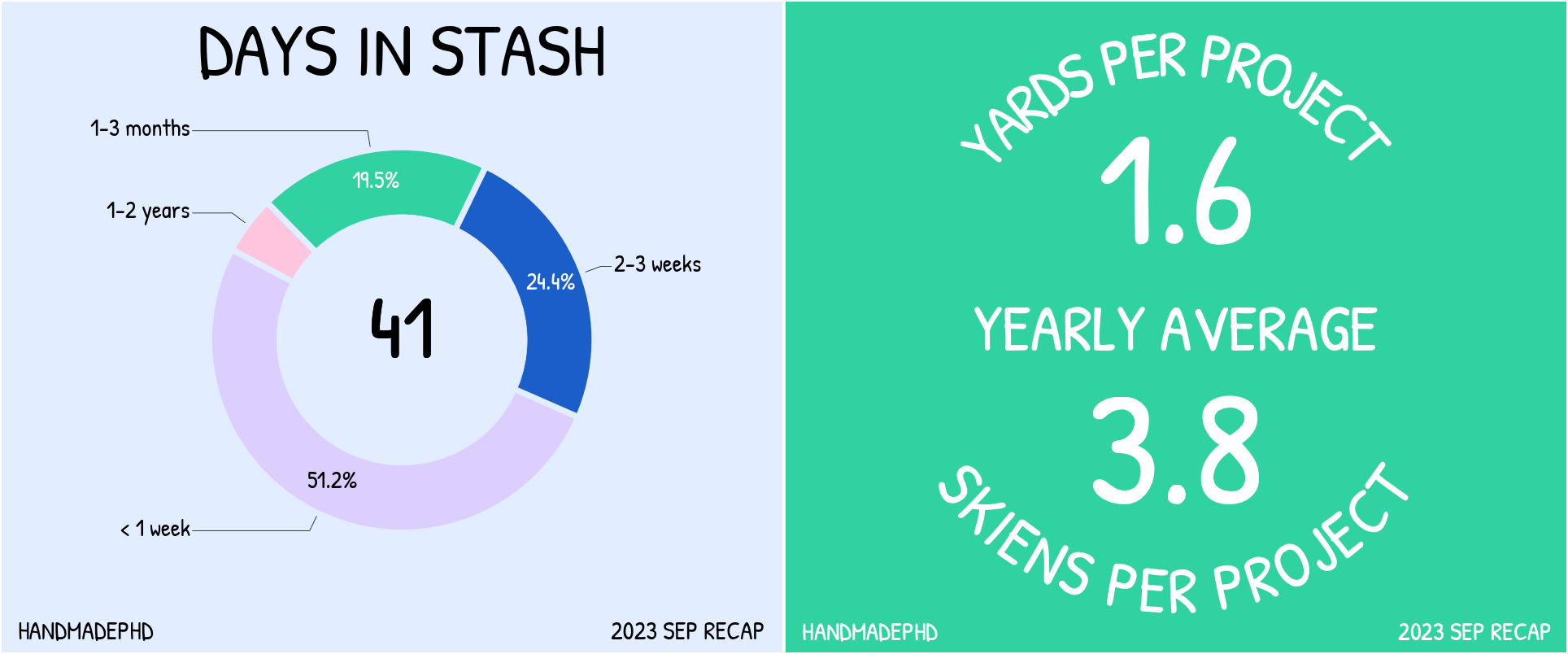 I have been doing good, adhering to my goal of purchasing materials only when I have a specific project in mind and utilizing them right away. Out of the 41 projects, I have used the material for 75.6% of them within three weeks. In the current year, my average fabric consumption per sewing project is 1.6 yards, while it is 3.8 skeins for knitting projects. I’ve been knitting a lot of socks lately, which doesn’t use a lot of yarn.