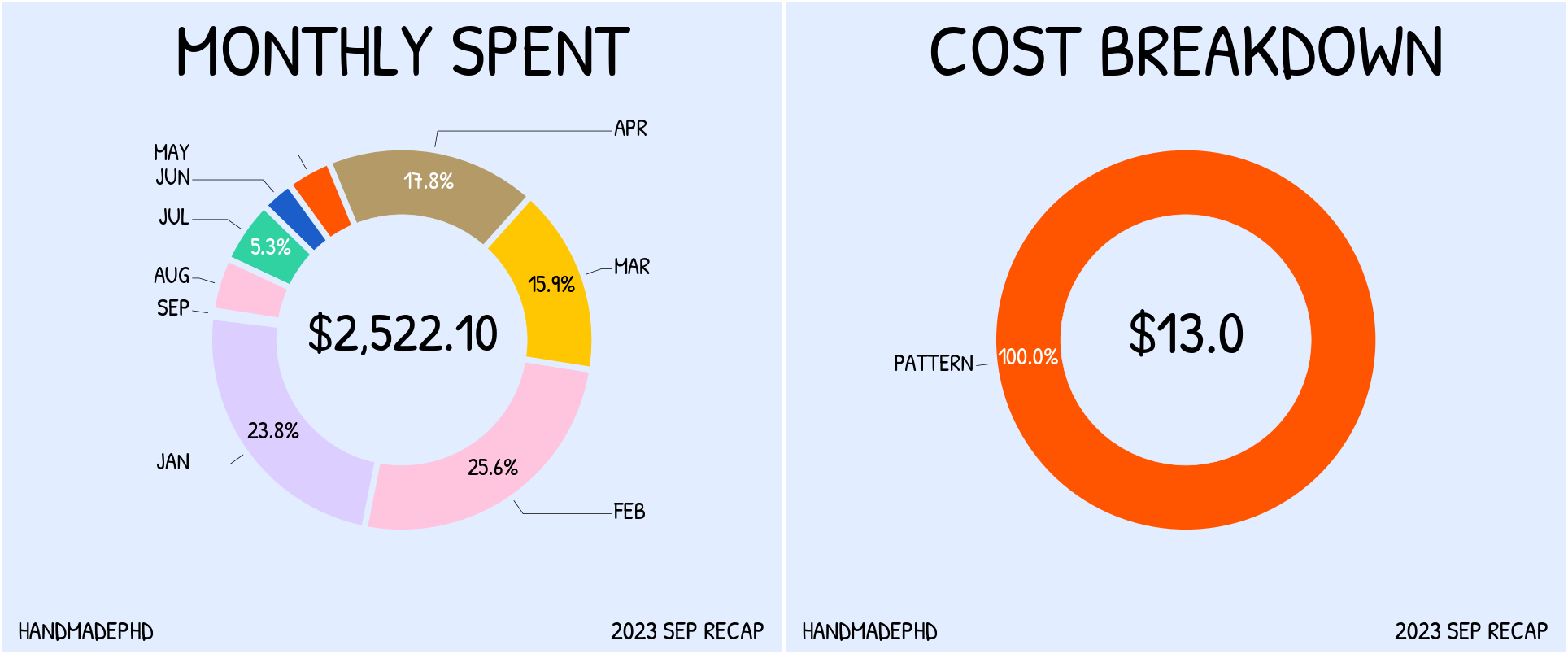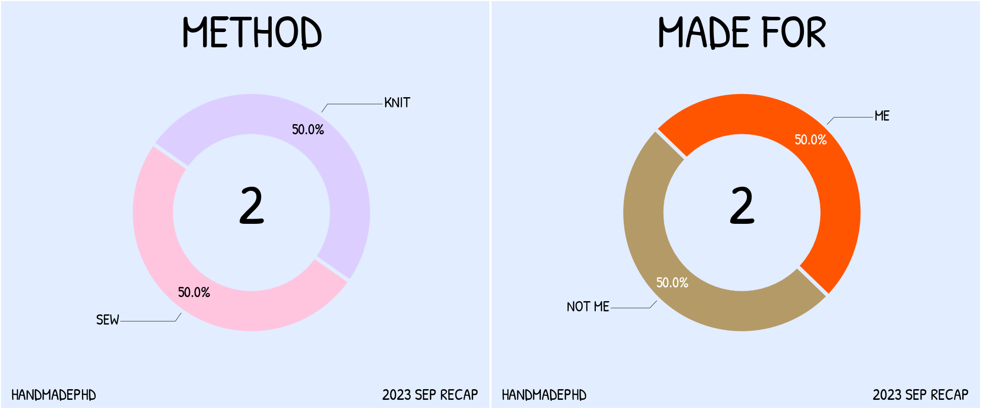 In the left figure, I purchased the trousers fabric last month (Amount Ordered: August, purple) and finally got around to using the fabric this month (Amount Used: September, tan). In the right figure, I’m also still using up all the sock yarn I purchased in June (Amount Ordered: June, green).