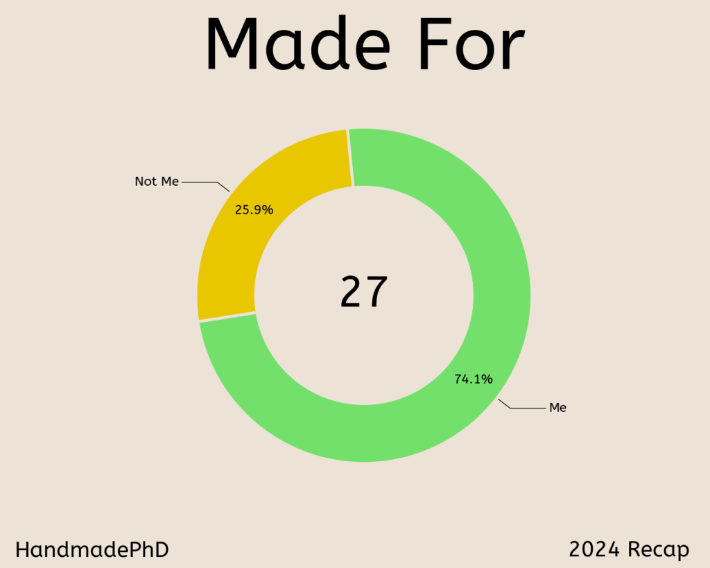 Finally, how long does my yarn or fabric sit in my stash before I use it? I’ve been super efficient this year and have used all the supplies I’ve received in the mail within 1 week 81.8% of the time. It’s helpful that many of my patterns are easy and/or repeated makes.