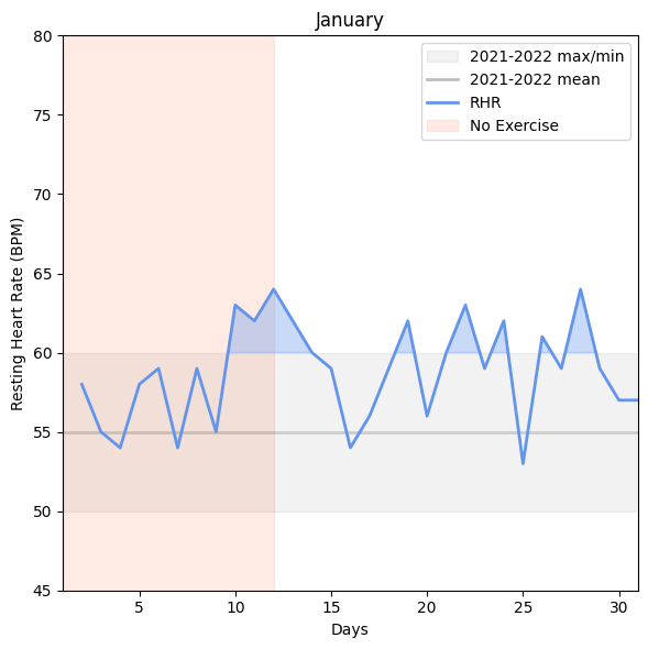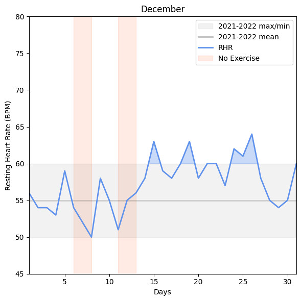From July through November, I occasionally had several week-long spikes in RHR that correlated with that unexpected pain in my leg, but it always “resolved” itself with rest. When I rested, I found compression socks and heating pads felt the best to manage the discomfort. However, by the time I got to December, the leg pain was nearly constant. Compression socks and heating pads were no longer working to manage my symptoms. I also started noticing my elevated RHR. I thought it was elevated because I was in pain, so it was “normal” and not something I should worry about. At this point, my heart rate rarely got down to average (55 BPM).