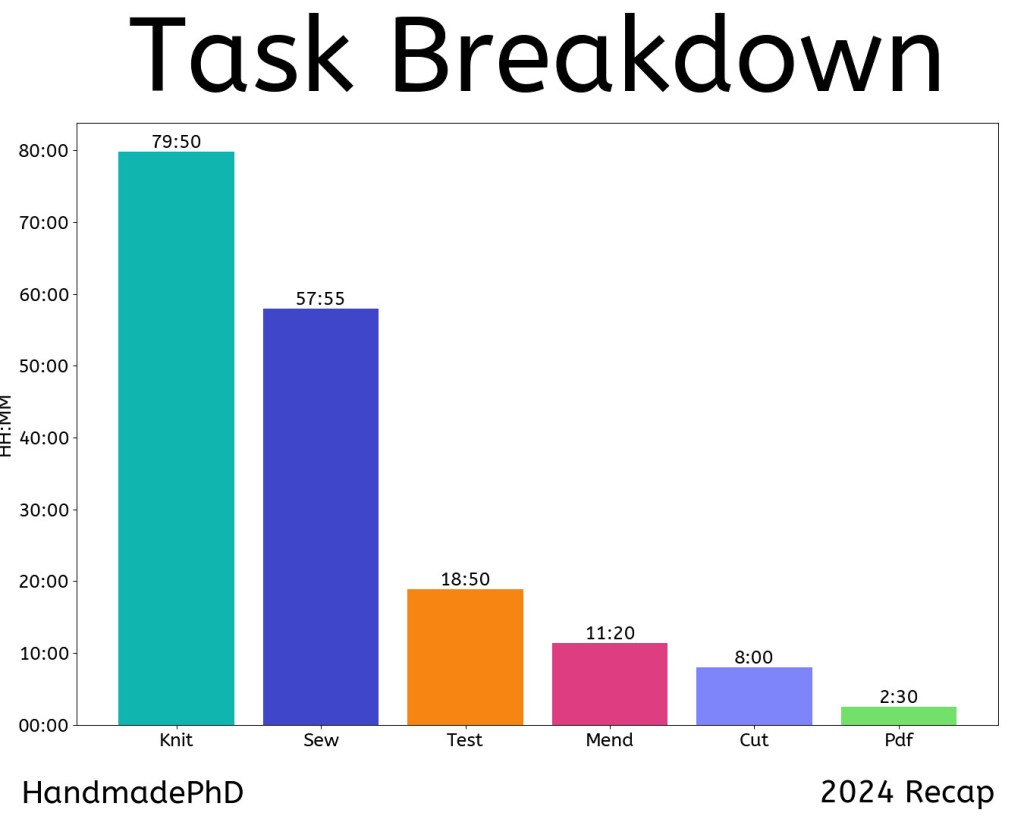 My task breakdown is as follows: almost 80 hours of knitting, 58 hours of sewing, 19 hours of testing, 11 hours of mending old projects, 8 hours of cutting fabric, and 2 hours and 30 minutes of taping together PDFs.