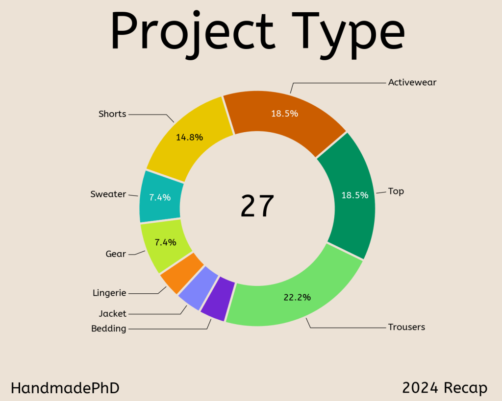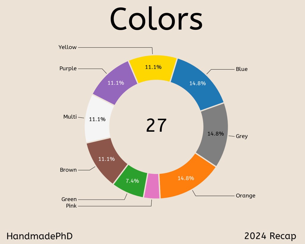 So, am I living up to my promise of picking more orange and yellow fabric this year? In 2024, yellow and orange each only made up 5.8% of all my projects. I’m definitely doing better this year than last.