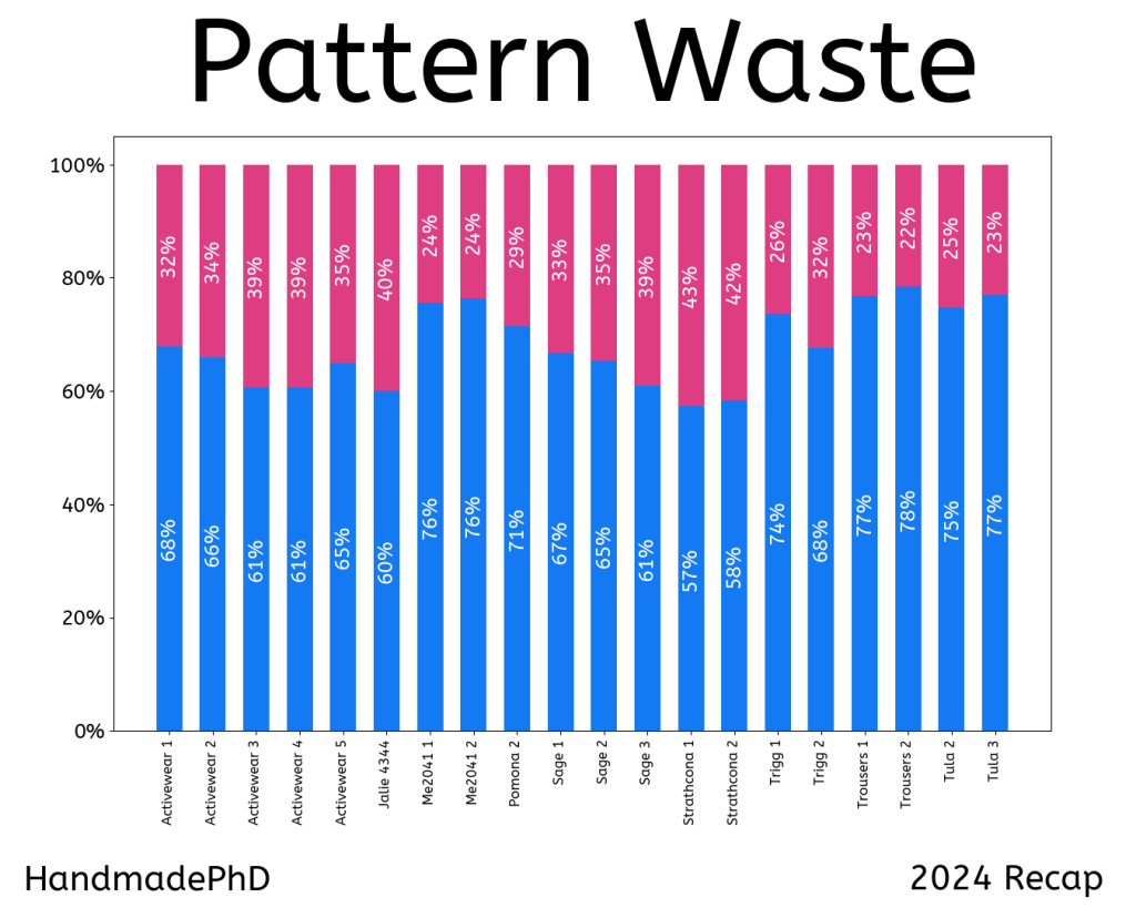 This year, I started keeping track of how much fabric waste (those little bits of scraps between pattern pieces when you cut out your pattern) I generate. As you can see from the patterns that generated waste, I’m between 24% and 43%. Trousers (ME2041, Pomona, Trigg, Trousers, and Tula) actually tend to be more economical, and I would have guessed they were the worst.