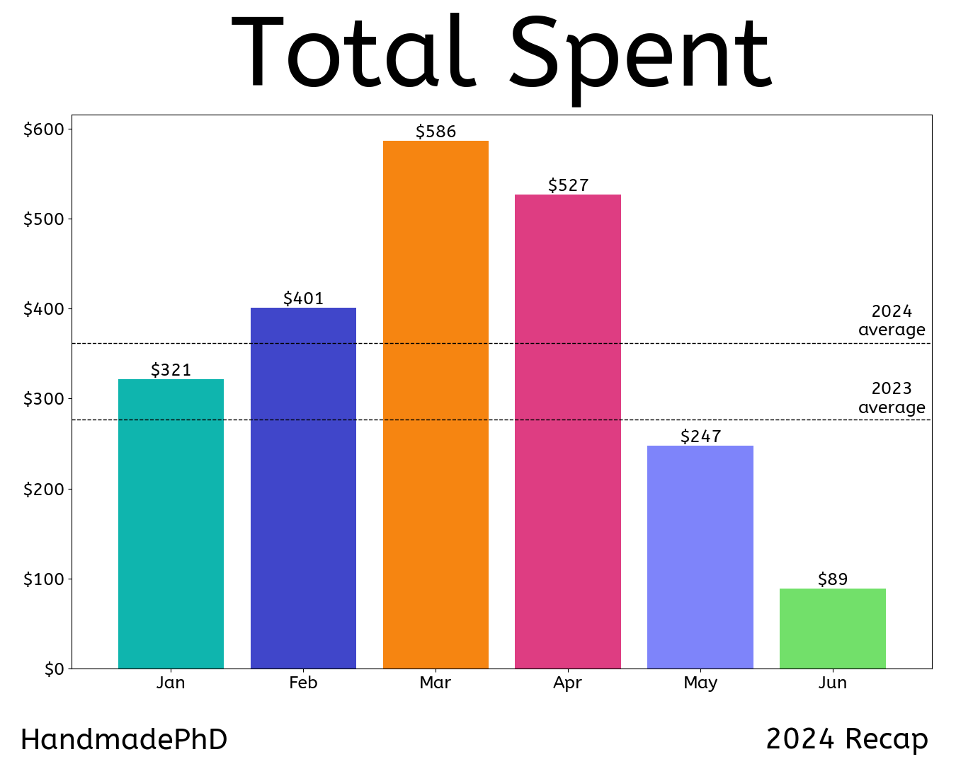 I have spent $2,171 this year, with my spending tapering off in June because I want to be outside as much as possible. I don’t like buying fabric during this lull in crafting because that means it’ll just sit in my stash too long. I should have more time to sew when school starts again in August. I say that was as much optimism as possible because I’m still waiting to see how I feel in August. I have always been one to suffer during the summer. The heat eventually triggers a lot of inflammation, and I’m completely spent by the time August hits. I’ve always said I had reverse seasonal depression. Hot and sunny weather always made me feel bad. And I’d normally only be motivated to lay in a cold, dark room until October. However, I am coping with summer much better this year (knock on wood). I know it’s due to the much-improved blood flow I have now that I’m taking anticoagulants.