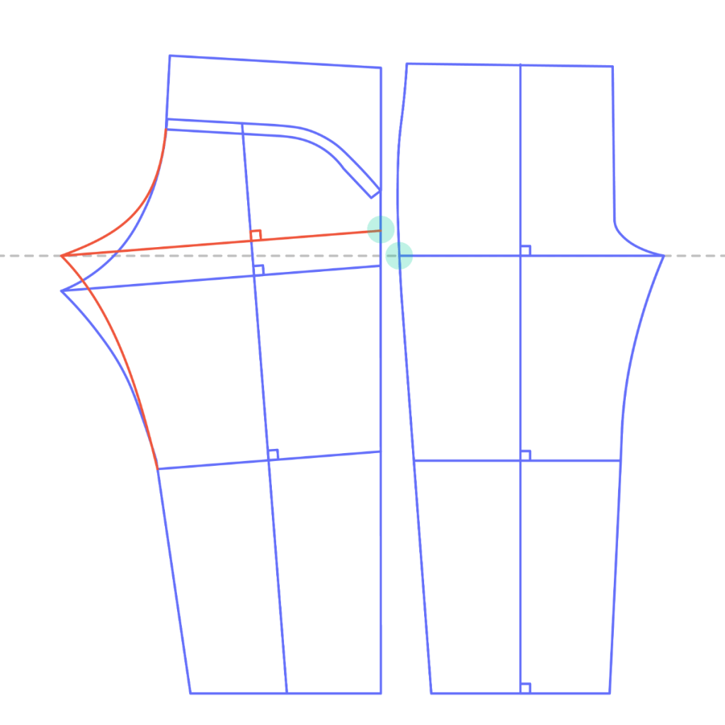 When trying to level the crotch curves on the original pattern, I immediately ran into a problem. If I raise the crotch curves to the same level, the back crotchline will be higher than the front crotchline (green dots).