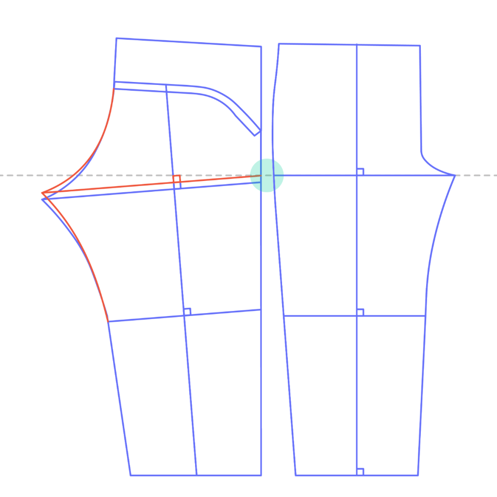 Instead, I raised the crotch curve up to the point where the crotchlines would meet at the side seams. It’s obvious that the drapelines really need to be parallel for this step to work (foreshadowing).